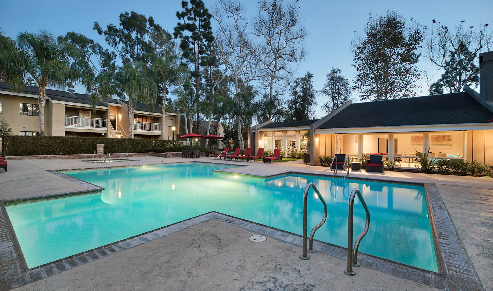 - Swimming pool and spa with umbrellas and lounge seating